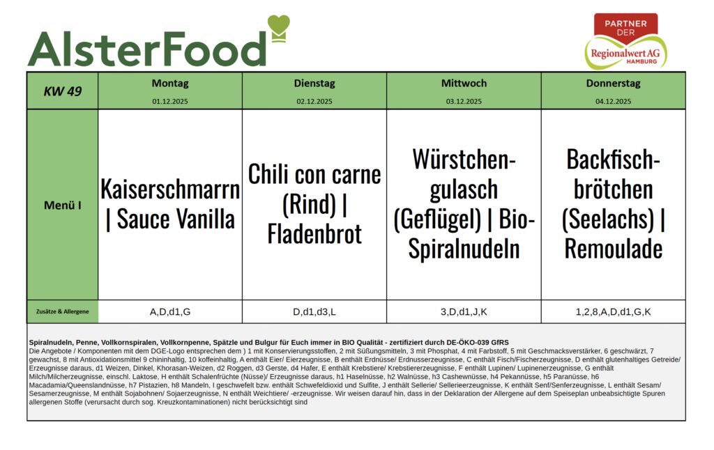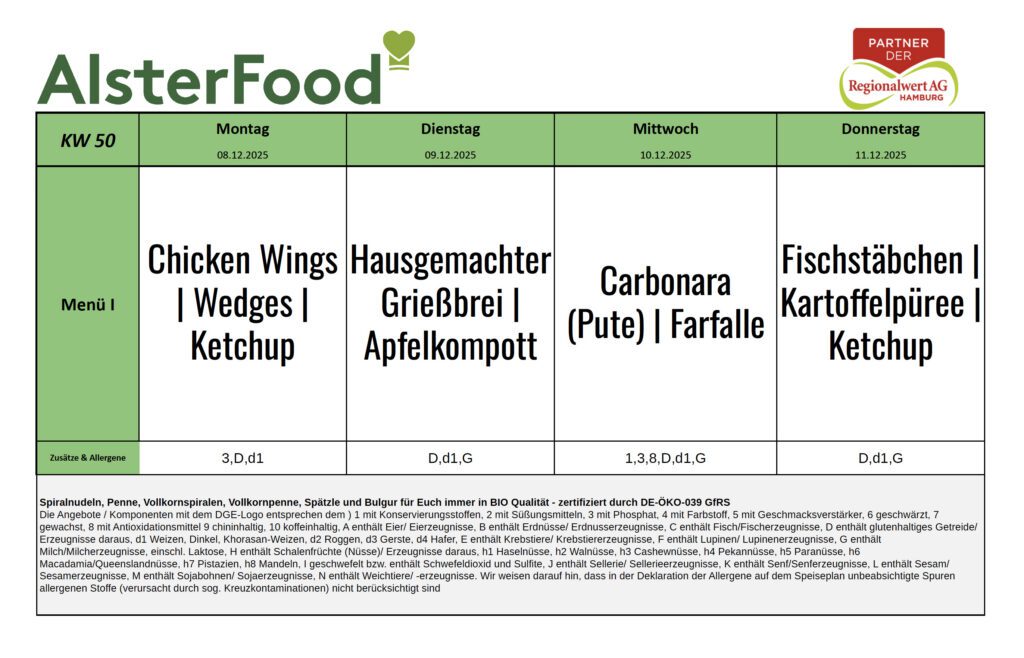 N enthält Weichtiere/ -erzeugnisse. Wir weisen darauf hin, dass in der Deklaration der Allergene auf dem Speiseplan unbeabsichtigte Spuren allergenen Stoffe (verursacht durch sog. Kreuzkontaminationen) nicht berücksichtigt sind.
